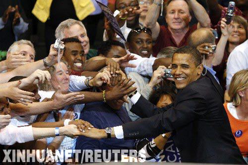 資料圖片:6月3日,美國伊利諾伊州聯邦參議員奧巴馬(右)在明尼蘇達州的圣保羅舉行的競選活動上與支持者握手。 新華社/路透