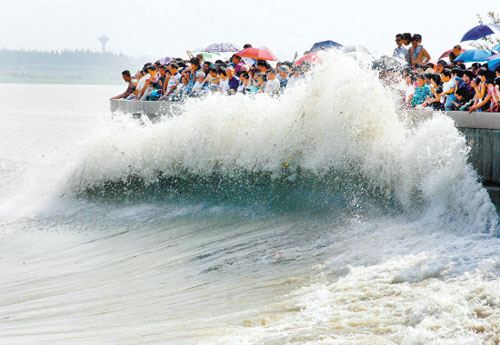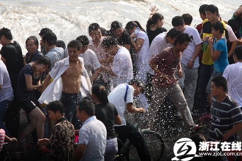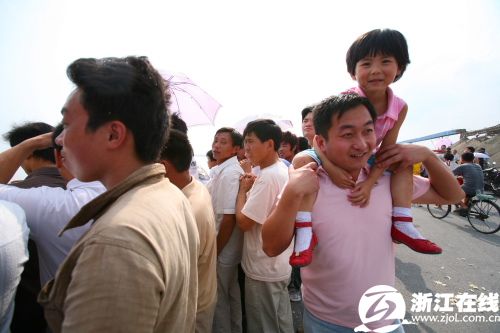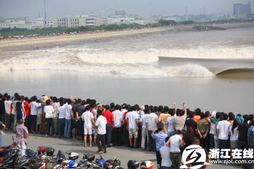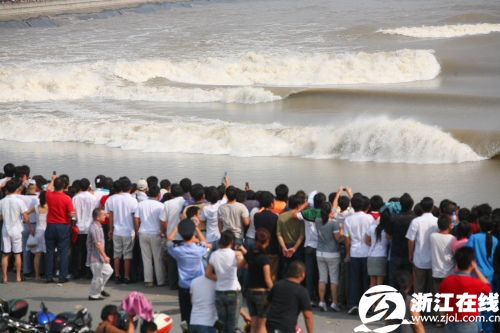 9月17日,錢塘江潮水奔涌而來。 當日是農歷八月十八,是觀看錢塘江大潮的最佳日子。據海寧市水文部門預測,9月17日前后,錢塘江潮涌將出現近5年以來的最大潮水——“潮頭”達2.5米至3米,潮差(即低潮位與高潮位的差距)在5米至7米間。 新華社記者 徐昱攝 昨天是農歷八月十八,各觀潮點迎來觀潮高峰,圖為當日下午2點40分左右,記者在下沙七閣拍到的眾人觀潮照片。(來源:浙江在線) 圖為昨天(17日)下午2點40分左右,杭州七堡江堤上驚濤拍岸,令等候多時的人們興奮不已。(來源:浙江在線)新華網杭州9月16日電(記者余靖靜)據浙江省海寧市水文部門預測,2008年9月17日(農歷八月十八)前后,素有“壯觀天下無”之稱的錢塘江涌潮將出現近5年來的最大潮水——“潮頭”達2.5至3米,潮差(即低潮位與高潮位的差距)在5至7米間。 2008中國國際錢江(海寧)觀潮節15日(農歷 八月十六)晚在浙江省海寧市鹽官觀潮景區開幕,記者從觀潮節上了解到,2008年錢塘潮涌為近5年來最高,是因為梅雨季節雨水充足等原因,給形成大潮提供了有利的條件。 據了解,5月通車的“世界第一跨海長橋”杭州灣跨海大橋在建造時充分考慮到要保護錢江潮這一自然資源,并沒有對錢江潮涌造成影響。 被譽為天下奇觀的錢塘江潮,是由海洋的潮汐通過錢塘江喇叭形的入海口而形成的。潮來時,江面上波濤洶涌,擁峰疊雪,蔚為壯觀。觀潮之風始于唐,盛于宋,每年的農歷八月十八,人們都爭相趕到杭州灣沿線,一睹潮水。 位于錢塘江北岸的海寧歷來被譽為“觀潮勝地”,在這里的鹽官等觀潮景點,可以看到“碰頭潮”“一線潮”“回頭潮”等壯觀景象,又稱“海寧潮”。自1994年以來,海寧每年中秋時節舉辦一次國際錢江觀潮節。2008年觀潮節將持續到9月19日(農歷八月二十)。 海寧鹽官觀潮景區管委會旅游市場部部長孫屹岳告訴記者,2008年觀潮節前后恰逢中秋節首次被列入國家法定節假日,僅9月14日(農歷八月十五)來鹽官參觀的游客就達10多萬人次,比往年翻了兩番。 驚濤拍岸。(來源:浙江在線) 大浪來襲。(來源:浙江在線) 9月17日,海寧市鹽官觀潮景區內的游客正在等待潮水的到來。 當日是農歷八月十八,是觀看錢塘江大潮的最佳日子。據海寧市水文部門預測,9月17日前后,錢塘江潮涌將出現近5年以來的最大潮水——“潮頭”達2.5米至3米,潮差(即低潮位與高潮位的差距)在5米至7米間。 新華社記者 徐昱攝 漲潮。(來源:浙江在線) 驚濤拍岸。(來源:浙江在線) 觀潮大軍。(來源:浙江在線) 在現場指揮的警察。(來源:浙江在線) 帶著孩子觀潮。(來源:浙江在線) |