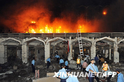 9月20日,人們在發生爆炸的巴基斯坦首都伊斯蘭堡的萬豪酒店進行救援。萬豪酒店當晚發生爆炸,已經造成至少50人死亡,多人受傷。 新華社/法新 9月20日,在巴基斯坦首都伊斯蘭堡,人們聚集在發生爆炸的萬豪酒店旁。新華社/路透 9月20日,巴基斯坦首都伊斯蘭堡的萬豪酒店因爆炸引發大火。新華社/法新 9月20日晚,巴基斯坦首都伊斯蘭堡的萬豪酒店發生爆炸,已造成至少25人在爆炸中喪生,多人受傷。這是停在萬豪酒店停車場的一輛轎車后玻璃被爆炸沖擊波震碎。新華社記者李敬臣攝 現場目擊:巴基斯坦首都一酒店遭恐怖襲擊 造成至少50人死亡 新華網伊斯蘭堡9月20日電(記者 李敬臣 李忠發)巴基斯坦首都伊斯蘭堡市內萬豪酒店20日發生爆炸,造成至少40人死亡、數10人受傷。 據警方初步調查,當地時間20日20時左右(北京時間22時左右),一輛裝載炸藥的汽車在沖向萬豪酒店門口后爆炸。由于爆炸威力巨大,包括大堂在內的酒店主體建筑被毀,酒店大部分建筑起火,酒店附近的幾個建筑物也不同程度受損。目前,傷者已被送往附近醫院進行救治,死者的尸體也已被運走。 爆炸發生后,巴基斯坦全國宣布進入高度戒備狀態。巴基斯坦總統扎爾達里和總理吉拉尼強烈譴責這起爆炸事件。爆炸發生前,扎爾達里剛在巴參議院和國民議會(下院)的聯合會議上發表首次演講,闡述了他在反恐和外交等領域的政策。 爆炸發生時,新華社記者正在萬豪酒店一樓的一家餐廳里。一聲巨響后,餐廳的燈全部熄滅,現場一陣慌亂,酒店供電幾分鐘后恢復。記者看到餐廳內灰塵四起,到處都是碎玻璃,人們踩著碎玻璃匆忙往外跑。人群中,記者不時看到有滿臉鮮血的受傷者。由于酒店前門已被封鎖,人們只能從酒店側面的健身區撤離。 在酒店前面,記者看到酒店主樓多個房間著火,整個大樓被濃煙籠罩。在停車場,記者汽車的后擋風玻璃已全部被震碎,車后的坐椅和后備箱撒滿了碎玻璃。 萬豪酒店是一家國際連鎖酒店,位于伊斯蘭堡市中心,很多外國游客和企業界人士都選擇這家酒店就餐和住宿。酒店周圍是重要的政府機構所在地。 截至目前,還沒有任何組織宣稱對這起爆炸事件負責。 滾動報道: 簡訊:巴基斯坦首都發生爆炸造成至少40人死亡 新華網伊斯蘭堡9月20日電(記者 李敬臣 李忠發)巴基斯坦首都伊斯蘭堡市內萬豪酒店20日發生爆炸,造成至少40人死亡,幾十人受傷。 新華網快訊:巴基斯坦首都伊斯蘭堡市內萬豪酒店20日夜發生的爆炸目前已造成至少20人死亡,20多人受傷。 2008年09月20日 23:12:51 新華網快訊:巴基斯坦首都伊斯蘭堡市內萬豪酒店20日夜發生爆炸,已經造成至少2人死亡,多人受傷。 2008年09月20日 22:48:57 |