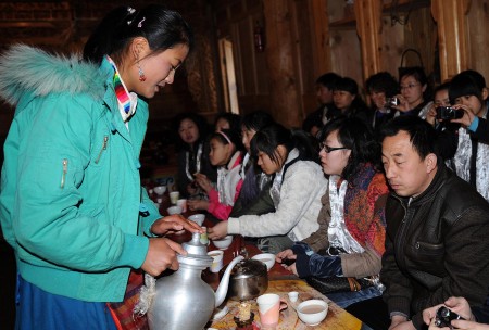 一名藏族姑娘在給游客倒酥油茶(攝于2月12日)。新華社記者藺以光攝