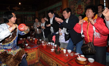 游客在云南省迪慶藏族自治州香格里拉縣體驗“藏民家訪”,人們歡歌笑語,其樂融融(攝于2月12日)。新華社記者藺以光攝