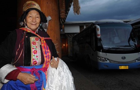 藏族婦女卓瑪拿著哈達在家門口等待游客的到來。依靠“藏民家訪”,她家年收入超過30萬元(攝于2月12日)。新華社記者藺以光攝 |
