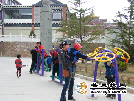 家長正帶領自己的小孩在噴泉廣場附近用健身器做健身。
