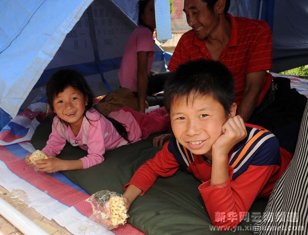 姚安縣官屯鄉官屯村的兩個孩子在帳篷里吃糕點(7月10日攝)。 截至7月10日晚,姚安縣地震受災點已搭建起3018頂帳篷,共安置受災群眾21802人,受災群眾基本生活得到保障。 據介紹,截至10日17時,姚安縣共接收到帳篷4200多頂、彩條布1000件、毛毯近200條、棉被4300多件、大米30噸、食用油1000桶、其他救災物資3100余件。 新華社記者 藺以光 攝[查看詳細>>] 姚安災區已搭建3000多頂帳篷 安置受災群眾2萬多人 據云南省姚安縣縣長李建波介紹,截至10日晚,姚安縣地震受災點已搭建起3000多頂帳篷,共安置受災群眾2萬多人,受災群眾基本生活得到保障。 據介紹,截至10日17時,姚安縣共接收到帳篷4200多頂、彩條布1000件、毛毯近200條、棉被4300多件、大米30噸、食用油1000桶、其它救災物資3100余件。 目前,姚安縣已發放帳篷3032頂、彩條布730件、毛毯198條、棉被3850件、其它物資2800余件,組織派送了25公斤裝大米1000袋、5公升裝食用油900桶。地震發生后,姚安縣及時動員有重大安全隱患村莊的群眾及時撤離到安全地帶,通過分散安置的辦法,及時轉移安置受災群眾。同時,確保受災群眾有臨時住所、有飯吃、有水喝、有衣穿、有病能救治、孩子有學上。截至10日晚,姚安縣各受災點已搭建起帳篷3018頂,全縣已安置受災群眾21802人,受災群眾情緒穩定,抗震救災各項工作正緊張有序進行中。 詳細>>