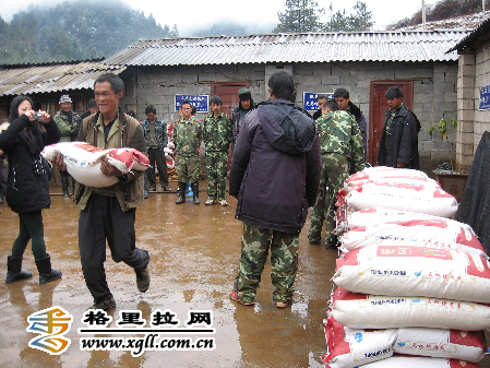 近日,維西縣保安公司干部踏雪送溫暖,為慶福村困難群眾送去9800斤優(yōu)質(zhì)大米。 楊洪程 攝影報道