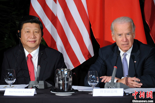 ????當地時間2月17日,中國國家副主席習近平與美國副總統拜登在洛杉磯共同會見出席中美省州長見面會的兩國省州長。中新社發 吳慶才 攝??