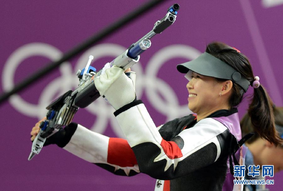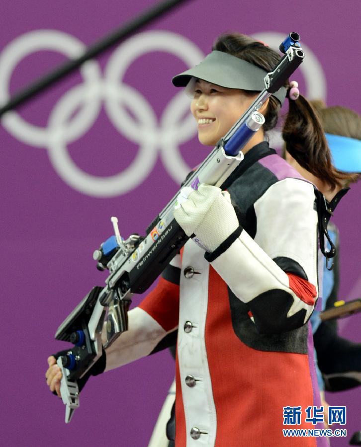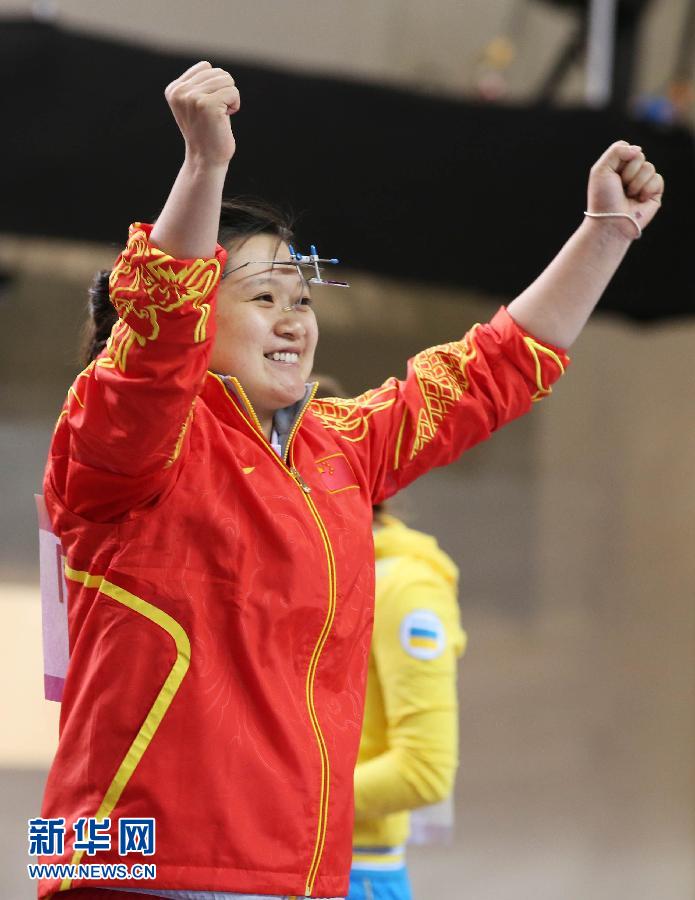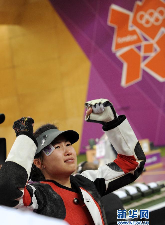 7月29日,郭文珺慶祝勝利。當日,在倫敦奧運會女子十米氣手槍決賽中,中國選手郭文珺以488.1環的總成績獲得冠軍。 新華社記者殷剛攝