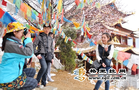 一場小雪過后,香格里拉獨克宗古城內,老屋、古寺、白雪、桃花,讓很多游客領略了香格里拉難得的一景。 記者從迪慶州氣象局獲悉,今天早上,全州大部分地區普遍降水,香格里拉縣城降水量達2毫米。預計今晚到明早,香格里拉縣將以小雪或陣雪天氣為主,白馬雪山或有小到中雪,明日天氣將轉好。氣溫突降,提醒廣大市民注意保暖防寒。(記者 石顯堯/攝) |