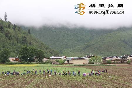香格里拉縣建塘鎮(zhèn)尼史村哈木谷村民在瑪咖地里除草,期望豐收。 (余麗芹 攝)