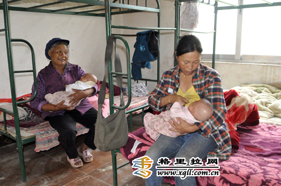 10日晚被轉移安置的格蘭村村民和春蘋在集中安置點給剛滿40天的雙胞胎女兒喂奶。