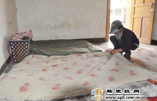 10日晚被轉移安置的格蘭村村民和金合在集中安置點鋪設被子。