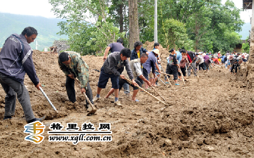 格蘭村群眾清理道路淤泥。(石顯堯 攝)