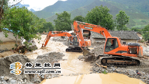 大型挖機對上江鄉仕旺河河道進行清理。(石顯堯 攝)