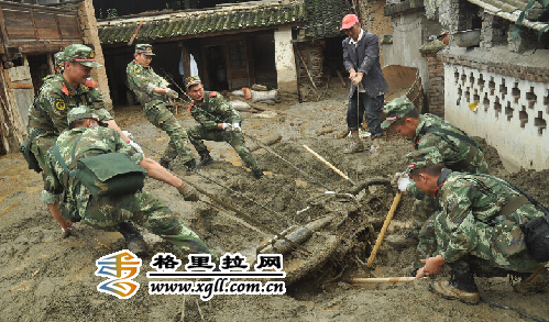 武警官兵幫助受災村民挖出被埋車輛。(吳邦純? 攝) |