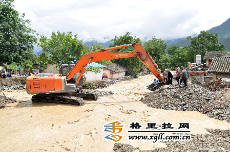 金江線主干線士旺河段在泥石流中嚴重被毀,河水暴漲,至今還在搶通中,過往人員只能靠大型機械或下游簡易木橋通過。