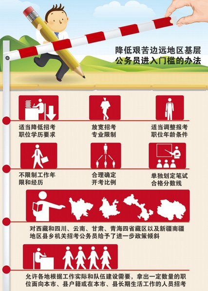 中共中央組織部、人力資源和社會保障部和國家公務員局近日聯合印發了《關于做好艱苦邊遠地區基層公務員考試錄用工作的意見》,就在艱苦邊遠地區適當降低公務員進入“門檻”的要求提出具體措施。 《意見》明確了降低艱苦邊遠地區基層公務員進入“門檻”的辦法,提出適當降低招考職位學歷要求、放寬招考專業限制、適當調整報考職位年齡條件等6條措施,并對西藏和四川、云南、甘肅、青海四省藏區以及新疆南疆地區縣鄉機關招考公務員給予進一步政策傾斜。同時對艱苦邊遠地區新錄用公務員最低服務年限、上級機關不得借調等問題作出了規定。此外,各地要從實際出發,做好服務保障工作,努力解決好艱苦邊遠地區新錄用公務員工作生活等方面的困難和問題,使他們熱愛基層、扎根基層,安心本職工作。 《意見》還指出,要堅持依法考錄,堅持“凡進必考”,嚴格控制降低進入門檻政策的適用范圍,不得簡化考錄程序;加強對考生政治素質和道德品行的考察,嚴禁針對特定人員設置與履職無關的資格條件,加大監督檢查力度,嚴肅處理違紀違規人員等。 如何讓基層公務員保“質” 適當降低門檻,是為了解決艱苦邊遠地區基層公務員荒的問題。然而,解決了“量”的問題后,“質”是否會下降? 中國人事科學研究院原院長、研究員吳江說,質量和素質是相對崗位適應性來講的。“降低門檻不等于沒有門檻”,新規堅持了公務員法的規定和“凡進必考”原則,只是使考錄政策更加科學靈活地適應實際需要。同時,降低基層公務員進入門檻的方式,客觀上增加了考生進入公職領域的機會,既是務實的選擇,也在很大程度上體現了公平正義。 如何防止“蘿卜招考”現象 近年來,個別地方出現了事業單位招聘中因人設崗的所謂“蘿卜招聘”、“內部招聘”,引起社會強烈不滿。 全國政協委員遲福林曾指出,導致“蘿卜招聘”問題的一個重要原因,在于監督缺位導致招錄、選拔人員與參考人員形成利益集團,破壞公開、平等、競爭、擇優的人事制度。 吳江說,防止這種現象的出現,從中央到地方要進一步強化監督,一方面要放開對基層的束縛,另一方面要做好監督,才能讓這項制度真正落在實處,讓人民群眾真正滿意。 如何解決基層公務員“留不住” 基層留不住人的問題,在全國不少邊遠地區都存在。 為此,《意見》也作出了一些“硬性”規定,新錄用的鄉鎮公務員在鄉鎮機關最低服務年限為5年,在此期間不得轉任交流到上級機關等。吳江認為,這都是在穩定隊伍方面采取的措施,既然降低門檻了就要有服務年限,否則就難以達到留住人的目的。 他還強調了“待遇留人”的方式,如有些地方嘗試將基層公務員的職級職務分開,提供晉升空間,特別是進一步拓寬待遇和職級掛鉤,讓長期在基層工作的人員有盼頭。(春城晚報 綜合新華社)? |