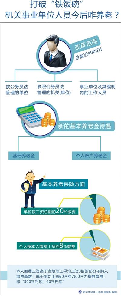 退休后養老待遇會變差么? 繳費后現在的工資會降么? 這幾天,近4000萬機關事業單位工作人員被這兩個問題深深地困擾。上周,國務院下發了《關于機關事業單位工作人員養老保險制度改革的決定》(以下簡稱《決定》),從2014年10月1日起,對機關事業單位工作人員養老保險制度進行改革。這意味著,機關事業單位將建立與企業相同的養老保險制度,進入繳費時代。 眾所周知,2015年是全面深化改革關鍵之年,剛開年就打出這張牌,必有深意。 退休待遇怎么樣? 改革前,機關事業單位工作人員退休工資是按“最終工資”的一定比例分檔計算,退休后的退休金大概為退休前的80%到90%,如果一名公務員退休前的工資為每月5000元,那么退休后能拿到4000到4500元。 由于退休前工資跟職務密切關聯,所以還出現了“提職一日游”的現象,即退休前提個職位,為了退休后多拿點兒工資。 改革后,按照《決定》,從2014年10月1日起,不管是公務員還是事業單位員工,養老待遇不再和職稱、級別掛鉤,而是和企業職工一樣,在職時單位和個人都要繳費,退休后到社保領取養老金。 按照規定,機關事業單位按照工資總額的20%繳費,個人按照繳費工資的8%繳納。單位交的錢計入統籌賬戶,形成統籌基金,現收現付,個人交的錢全都計入個人賬戶,退休后才能支取。個人賬戶部分可以繼承,超額部分由社會統籌補充。 除了基本養老保險制度外,本著構建多層次養老保險體系的初衷,機關事業單位還會實施職業年金,資金來源由兩部分構成:單位按工資總額的8%繳費,個人按本人繳費工資的4%繳費,兩部分資金構成的職業年金基金都實行個人賬戶管理。工作人員退休時,依據其職業年金積累情況和相關約定按月領取職業年金待遇。 此外,機關事業單位退休人員的工資不再由原單位發放,而是由養老保險基金支付,待遇調整不再與同職級在職職工增長工資直接掛鉤,而是與企業退休人員以及城鄉老年居民基本養老待遇調整統籌考慮,避免了一些退休職工較多、退休金負擔較重的單位不敢給在職員工漲工資的局面。 為了配合養老并軌,降低改革的阻力,機關事業單位工作人員工資調整方案也配套出臺。國務院辦公廳為此轉發了3個實施方案并已經發到各單位,一是公務員基本工資的調整,二是事業單位工作人員基本工資的調整,三是機關事業單位離退休人員待遇的調整。 按照人力資源和社會保障部副部長胡曉義的解釋,對絕大多數人來講,如果不是極特殊情況,待遇水平都會有所增加,至少是不降低。 養老金怎么發? 改革之后,機關事業單位工作人員的養老金按照“老人老辦法,新人新辦法”來發放。 在2014年10月1日之前已經退休的“老人”,還和以前一樣,維持原待遇不變。2014年10月1日之后參加工作的“新人”,完全按照新辦法實施,在職時繳費,退休時領取基本養老金,這個養老金為基礎養老金和個人賬戶養老金之和。 情況最復雜的是單位的“中人”,也就是2014年10月1日之前參加工作,10月1日之后退休的這部分人,在《決定》中,改革前算作“視同繳費”。“中人”又分為兩種情況,一種是退休時,個人繳費年限累計不足15年的“中人”,退休后的養老保險關系和養老金的計發比照《實施〈中華人民共和國社會保險法〉若干規定》執行。按照《規定》,累計繳費不足15年的,可以延長繳費至滿15年。或者可以轉入城鄉居民基本養老保險,享受相應的養老保險待遇。 對繳費年限累計滿了15年的“中人”,這次改革設定一定期限的過渡期,在過渡期內實行新老辦法對比。新辦法計發的養老金低于老辦法的,按老辦法補齊,新辦法計發的養老金高于老辦法的,對高出部分會有所限制。 因為這次改革設定了一個過渡期,因此繳費年限累計滿了15年的“中人”,在過渡期內,基本養老金就比“新人”多出一塊,在發放基礎養老金和個人賬戶養老金的基礎上,還會依據視同繳費年限長短等因素發給過渡性養老金。對于“中人”的過渡性養老金怎么計算發放,相關政策還在制定當中。 那每月領取的基礎養老金和個人賬戶養老金又怎么計算呢? 簡單說,決定基礎養老金多少的有三個因素,一個是所在地區上年度在崗職工的月平均工資,這就意味著,在不同地區、不同年份退休的人員,他的基礎養老金是不同的。第二個是本人每月繳費工資的平均數,比如繳了20年,這個平均數就是20年里,每個月的繳費工資相加,除以240個月。第三個是繳費的年限。 以今年要退休的老王為例,他所在省2014年在崗職工的月平均工資是4000元,假設老王已經繳費35年,每月繳費工資的平均數是3000元,那么老王的基礎養老金的計發基數就是兩者相加除以2,即3500元,然后根據繳費的年限,每繳費一年計發1個百分點,老王繳了35年,他的基礎養老金就是3500乘以35%,即1225元。這個基礎養老金是固定的,如果要調整的話,則要根據政府要求統一進行。而個人賬戶養老金,則是根據退休時個人賬戶累計的本息,除以規定的計發月數所得。按照《決定》的個人賬戶養老金計發月數表,退休年齡越大,對應的計發月數越小,也就是說繳費時間越長,繳費越多,退休拿到的錢也越多。 錢從哪里來? 養老金“并軌”之后,將面對機關事業單位養老金的錢從哪里來的問題。上世紀九十年代初開始啟動的企業養老保險制度改革,就產生了巨大的“改制成本”,而消化這個成本花費了非常長的時間。這次改革,也不