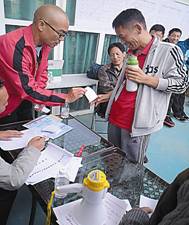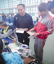 乒乓球館來了售賣專業球拍的人,有人一次就買了幾副拍子,摩拳擦掌、躍躍欲試。( 實習記者 吳丹 攝影報道 )?