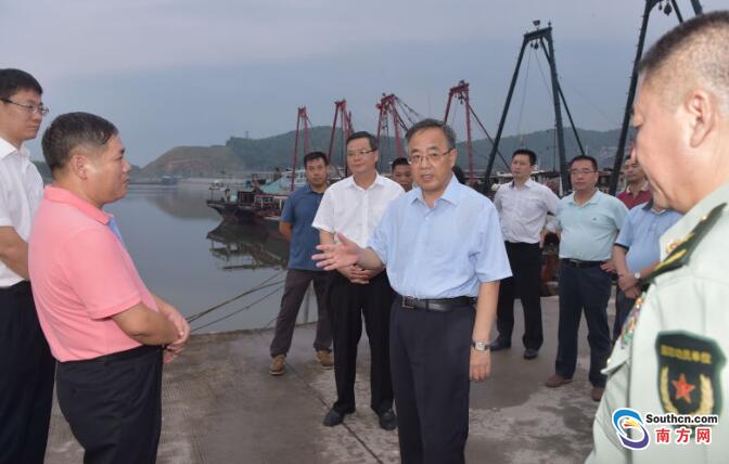 胡春華在東莞新灣社區漁政碼頭檢查臺風“妮妲”防御工作。