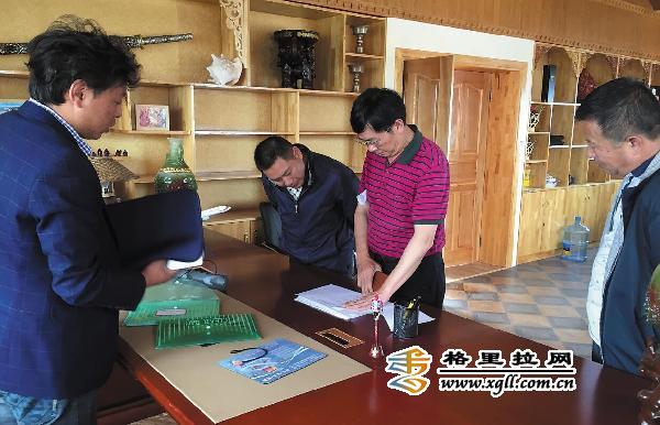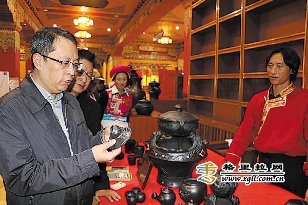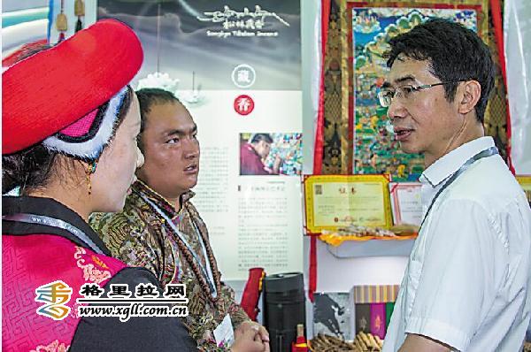 ????? 2015年云南文博會期間,省文產辦專職副主任劉榮察看迪慶參展企業