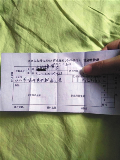 家長在當地銀行向仙桃一中繳納學費6280元的憑證。本版圖片/受訪者提供