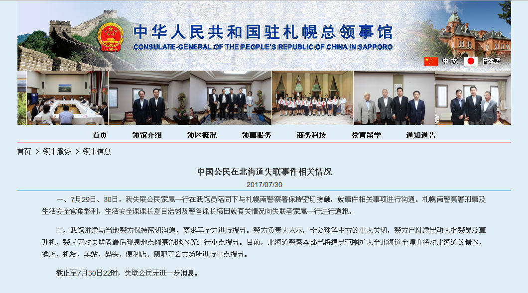 7月29日、30日,失聯女教師危秋潔的家屬一行在領事館工作人員陪同下與札幌南警察署保持密切接觸,就事件相關事項進行溝通。 札幌南警察署刑事及生活安全官角彰利、生活安全課課長夏目浩樹及警備課長橫田就有關情況向失聯者家屬一行進行通報。 總領事館繼續與當地警方保持密切溝通,要求其全力進行搜尋。警方負責人表示,十分理解中方的重大關切,警方已陸續出動大批警員及直升機、警犬等對危秋潔最后現身地點阿寒湖地區等進行重點搜尋。目前,北海道警察本部已將搜尋范圍擴大至北海道全境,并將對北海道的景區、酒店、機場、車站、碼頭、便利店、網吧等公共場所進行重點搜尋。 失聯者家屬告訴記者,警方向家屬通報的內容除了擴大搜索范圍,目前沒有其他的了。 此外,早前日本媒體報道里提到的“告別信”,危秋潔閨蜜稱,不能叫做告別信,里面有提到感恩父母的一點內容,但“告別”一詞并沒有出現,而且危秋潔爸爸明確表示,該信文字真假需要鑒定。危秋潔閨蜜還表示,危秋潔的日本行程,本來是約好和一位同事同行,因為同事后來有事去不了,她才一個人去的。 截至北京時間30日晚10:53記者發稿時,警方仍未找到危秋潔。(人民網) ? |
