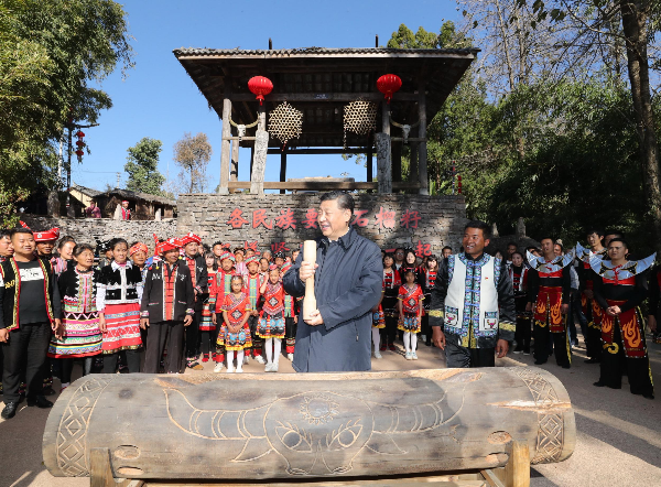【習近平敲響佤族祝福木鼓】 19日下午,習近平總書記來到騰沖市清水鄉三家村中寨司莫拉佤族村看望鄉親們。村寨廣場上,熱鬧的佤族春節民俗活動吸引了總書記的目光。《佤寨歡歌》歌聲嘹亮,村民們身著民族服飾載歌載舞,喜氣洋洋。習近平按照當地習俗,拿起鼓棒,敲響三聲木鼓,祝福風調雨順、國泰民安、四海升平,并向鄉親們致以新春祝福。