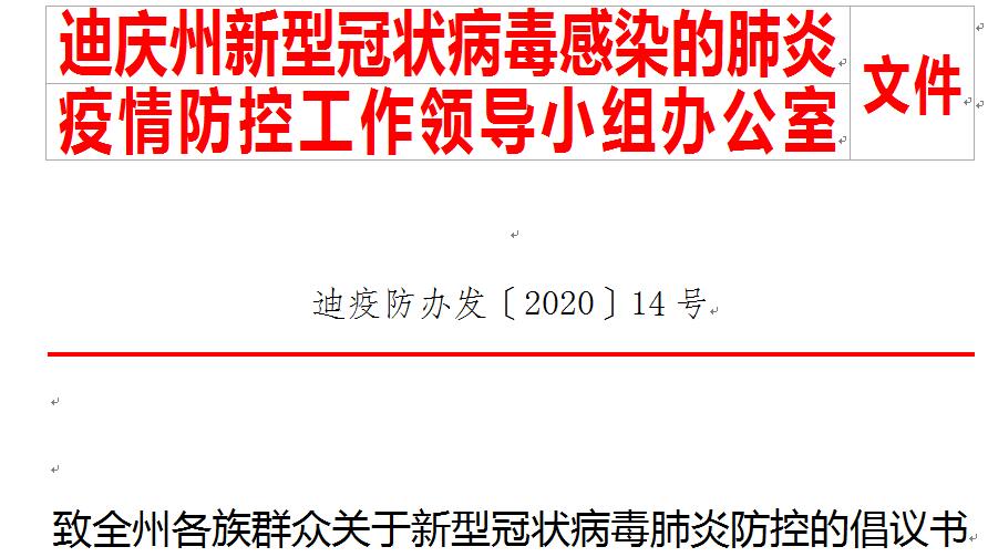 為切實(shí)做好迪慶州境內(nèi)新型冠狀病毒感染的肺炎疫情的防控工作,強(qiáng)化聯(lián)防聯(lián)控,確保全州各族群眾的身體健康和生命安全,根據(jù)疾控與醫(yī)療專(zhuān)家建議,特向全州各族群眾發(fā)出以下倡議: