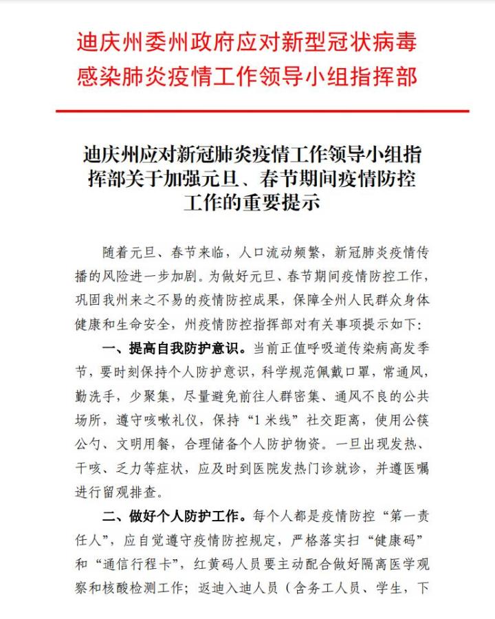 【事關元旦、春節】迪慶州疫情防控指揮部發布重要提示!