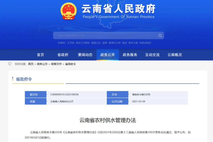 第220號(hào)《云南省農(nóng)村供水管理辦法》發(fā)布