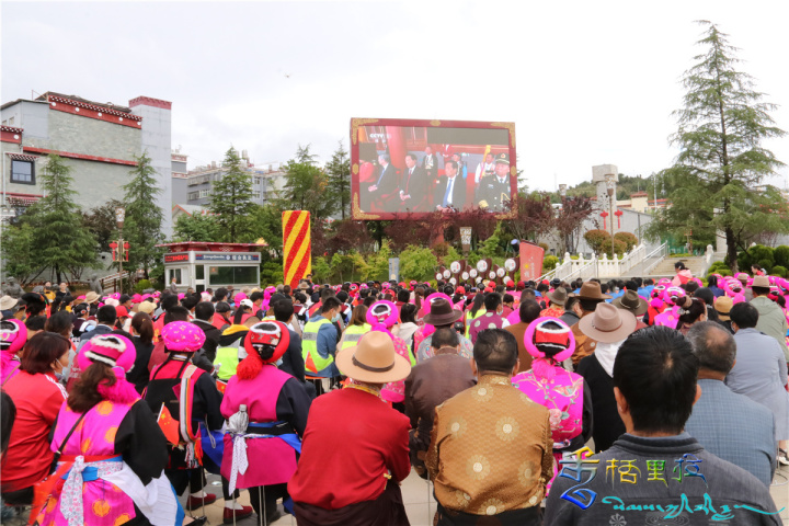 7月1日上午8時,慶祝中國共產黨成立100周年大會在北京天安門廣場隆重舉行。中共中央總書記、國家主席、中央軍委主席習近平發表重要講話。迪慶高原的各族干部群眾身著節日盛裝,懷著激動的心情,在藏家小院、雪山腳下、金沙江畔、瀾滄江邊,通過電視、網絡、手機等收聽收看慶祝大會直播。