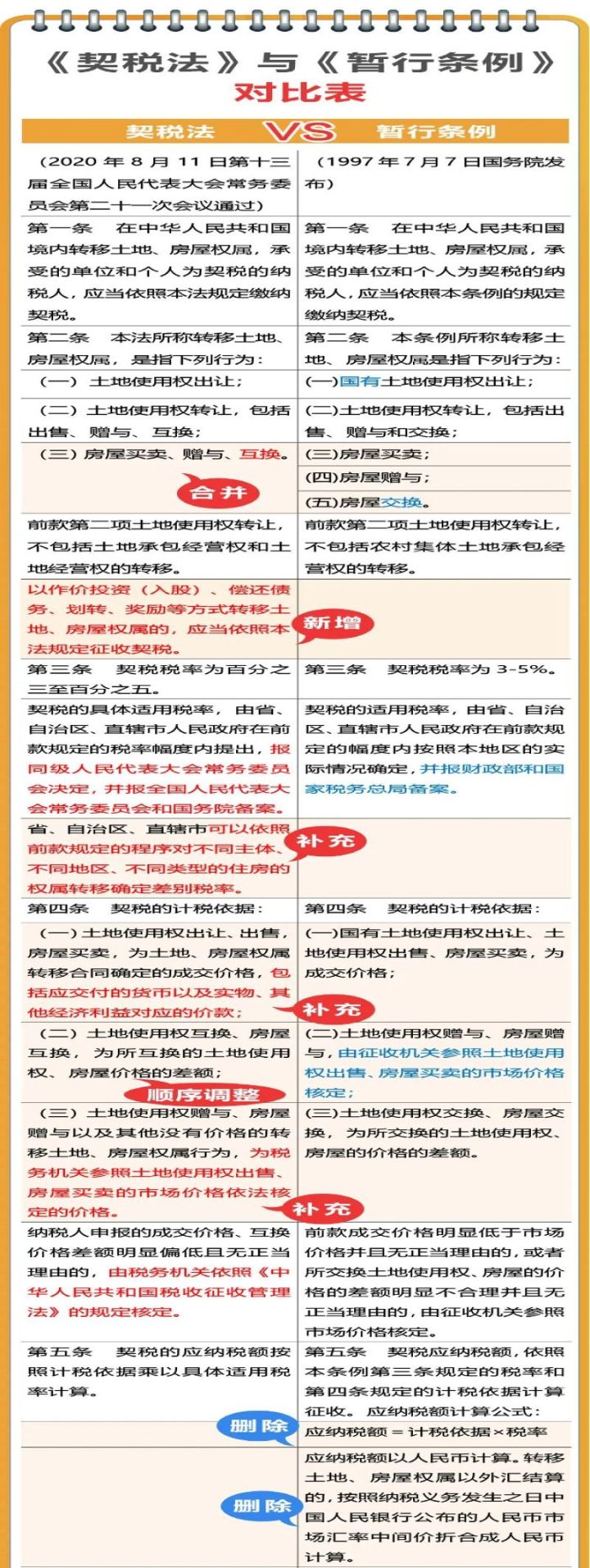 《中華人民共和國契稅法》(以下簡稱“《契稅法》”)自2021年9月1日起施行,《中華人民共和國契稅暫行條例》(以下簡稱“《暫行條例》”)同時廢止。契稅的稅率是否真的提高了?《契稅法》與《暫行條例》相比,哪些規定變了,哪些沒變?別著急,我們已幫你整理好了↓↓↓