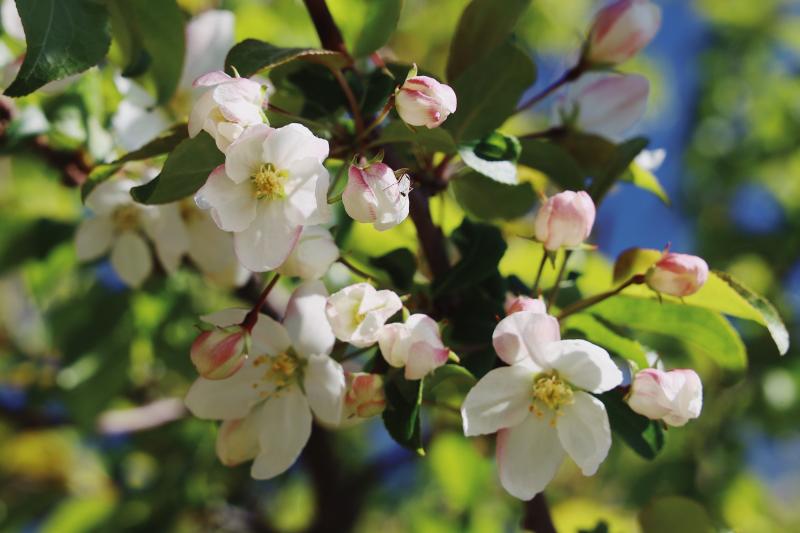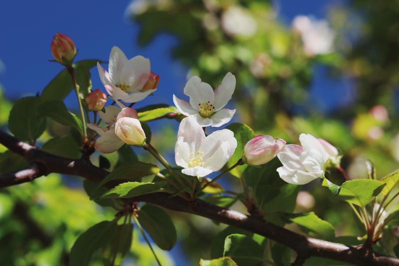 5月,香巴拉公園內各色花卉競相開放,天藍更襯花紅,杜鵑花、海棠花、櫻桃李花在光影下變幻著不同的美。微風輕拂,花色明亮,季節的故事在這一片片花色中演繹開來。(何雨桐 攝影報道)