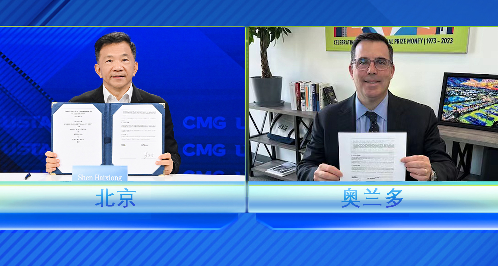 △中央廣播電視總臺臺長慎海雄與美國網球協會首席執行官洛·謝爾簽署合作備忘錄 根據中央廣播電視總臺與美國網球協會的合作備忘錄,雙方就加強美網新周期版權合作、聯合組織網球賽事、推動中國青少年網球運動發展等方面達成一致。雙方均表示,中美兩國有著龐大的網球愛好者群體,開展雙方的全面合作深得民意。美國網球協會(USTA)成立于1881年,致力于促進和發展美國網球運動。為滿足不同人群的需求,協會在全美舉辦大量各級別的網球賽事,其中,美國網球公開賽是世界網球四大滿貫賽事之一。 北美職業冰球聯盟,中央廣播電視總臺總編室、體育青少節目中心、國際交流局、北美總站等相關部門負責人參加活動。 (攝影:孫楠) 來源:央視新聞客戶端
