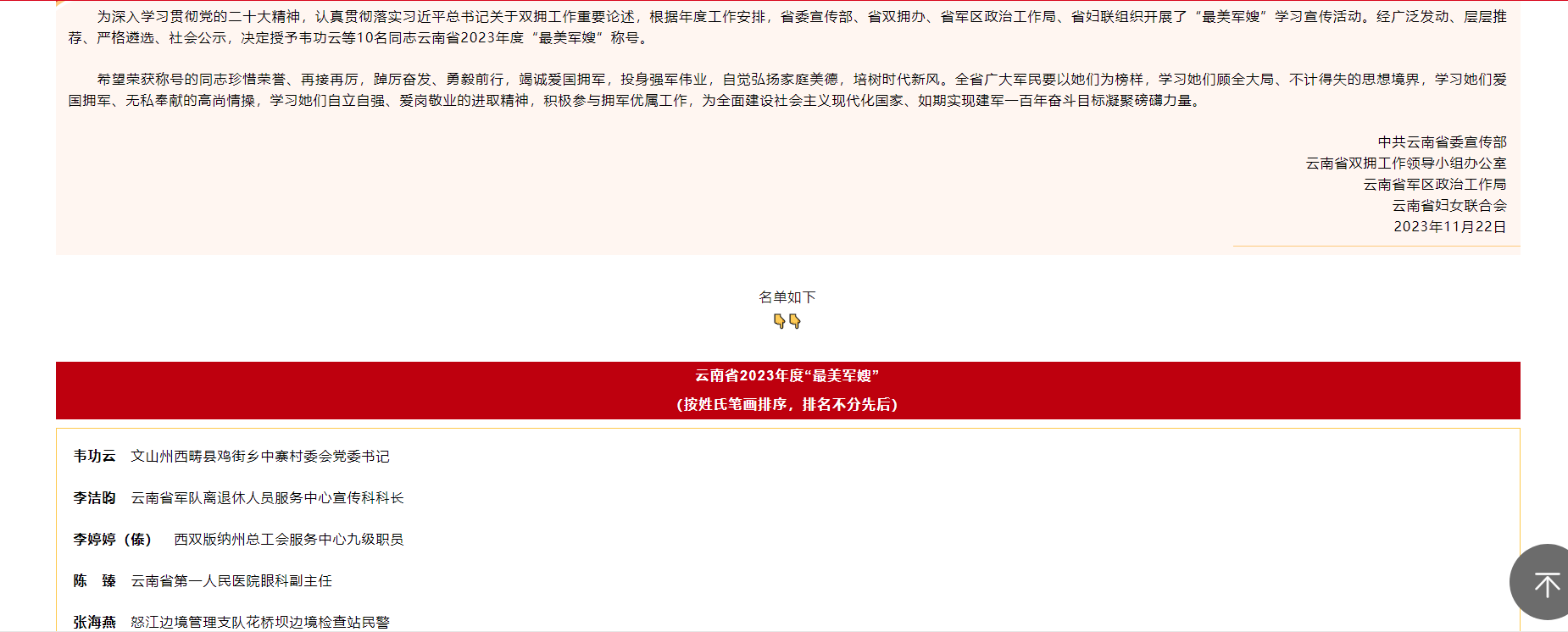 近日 中共云南省委宣傳部云南省雙擁工作領導小組辦公室 云南省軍區政治工作局云南省婦女聯合會 聯合印發決定授予韋功云等10名同志 云南省2023年度“最美軍嫂”稱號 https://mtydazzle.yunshicloud.com/pages/details/details.html?docid=F20577249E0C428181BB6A949923EF10 |